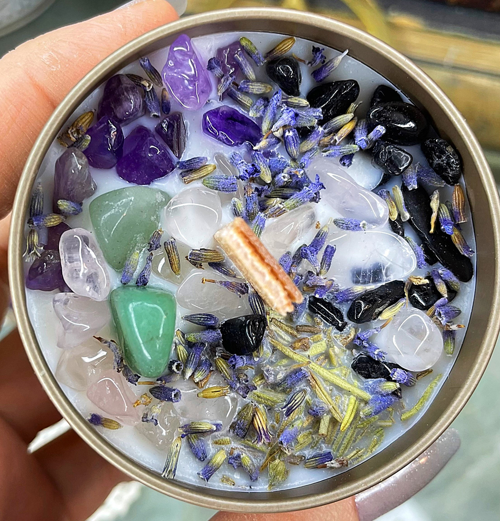 Blessings & Protection Candle: lavender, Rosemary, obsidian, rose Quartz, aventurine, amethyst, soy wax