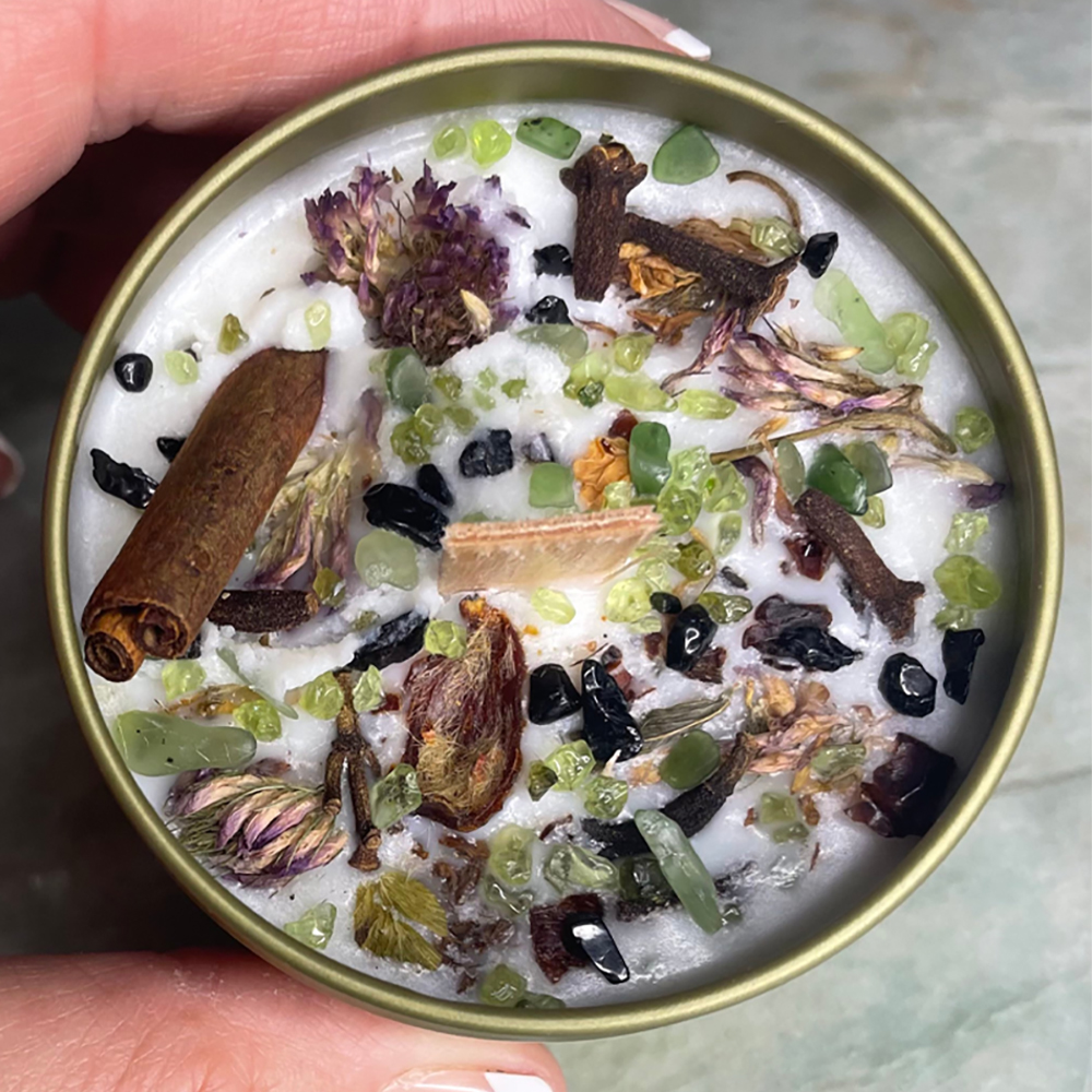 Money Spell Candle: cloves, hemp wick, rose hips, cinnamon, red clover, jade, black tourmaline, peridot, soy wax